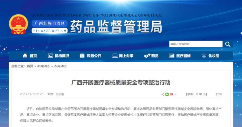 据广西壮族自治区药监局官网消息,近日,该局部署在全区范围内开展医疗器械质量安全专项整治行动,要求各级药品监管部门聚焦医疗器械安全风险隐患、强化重点产品、重点企业、重点区域监管,督促落实医疗器械注册人备案人经营企业使用单位主体责任和监管部门监管责任,推动医疗器械产业高质量发展,保障人民群众用械安全。