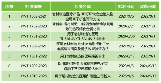 我们在中检院官网“医疗器械标准目录查询”中用关键词“增材制造”进行检索,共检索到7条医疗器械行业标准(其中有两项标准暂未实施),具体如下: