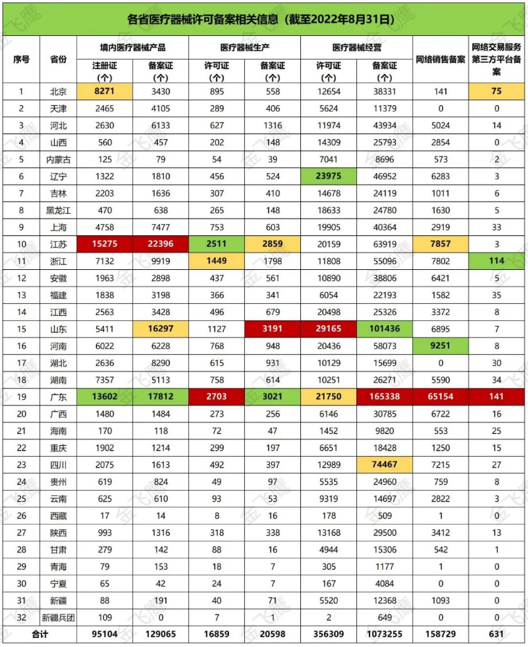 9月14日,国家药监局公布了截至2022年8月31日各省有效期内医疗器械产品注册备案、医疗器械生产企业许可备案等信息,金飞鹰小编对此稍作编辑,标注红色、绿色、黄色的分别为前三甲。