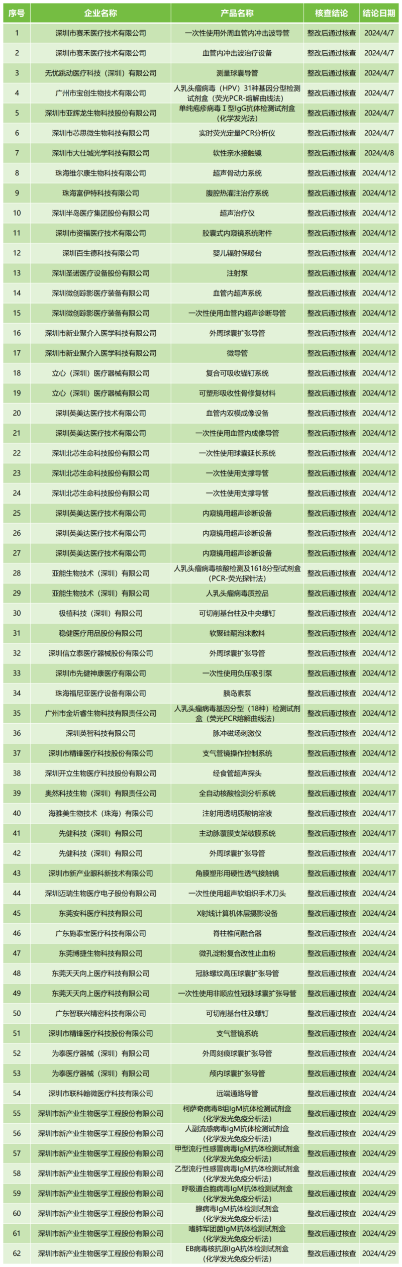 5月21日,广东省药监局官网公布2024年4月医疗器械注册质量管理体系核查结果,包括深圳半岛医疗集团股份有限公司的超声治疗仪、海雅美生物技术(珠海)有限公司的注射用透明质酸钠溶液、珠海福尼亚医疗设备有限公司的胰岛素泵等共计62款产品,均为“整改后通过核查”。具体明细见下方表格: