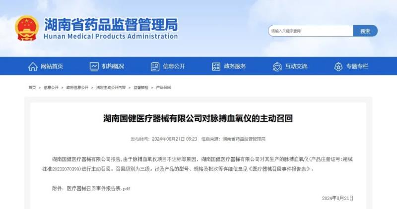 8月21日,湖南省药监局官网发布一则召回公告,其中提到,由于脉搏血氧仪项目不达标等原因,湖南国健医疗器械有限公司对其生产的脉搏血氧仪(产品注册证号:湘械注准20232070399)进行主动召回。召回级别为三级。通过查看附件《医疗器械召回事件报告表》我们可以发现,涉及产品已在中国销售49台。