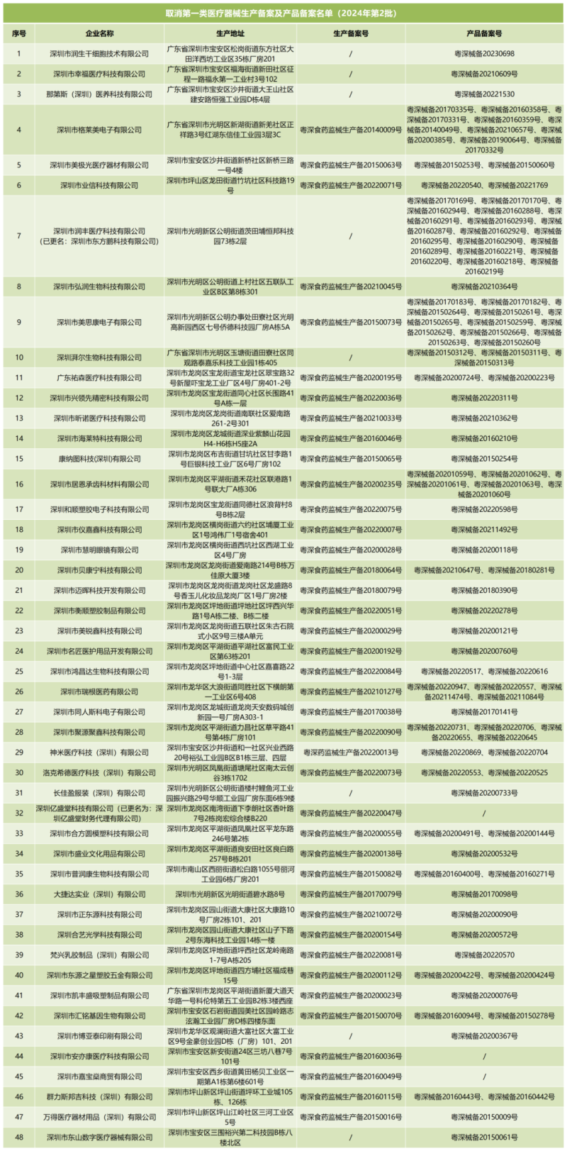 9月3日,深圳市市场监督管理局官网发布一则取消第一类医疗器械生产备案及产品备案的公告,该公告指出,因深圳市润生干细胞技术有限公司、深圳市幸福医疗科技有限公司、深圳市格莱美电子有限公司等48家医疗器械备案人存在无法取得联系、商事主体已注销或长期停产不主动取消备案等问题,不具备原备案条件,不能保证产品安全、有效,该局在公示期结束后决定取消这些企业名下的第一类医疗器械生产备案及产品备案,具体明细如下: