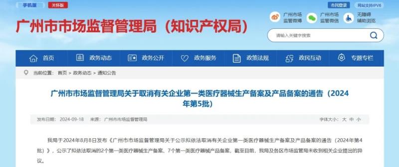 9月18日,广州市市场监督管理局官网发布一则取消第一类医疗器械生产备案及产品备案的通告,通告指出,因广东嘉雅医疗器械有限公司、广州市欧之康医疗器械有限公司未在备案场所经营且无法联系,在公示期间该局及各区市场监管局未收到相关企业提出的异议。