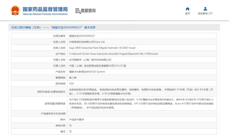 近日,国家药监局发布公告称,2024年9月,国家药监局共批准注册医疗器械产品444个。在批准注册的产品清单附件中,有一款进口第三类医疗器械引起了我们的注意——强脉冲光射频治疗仪。我们通过检索附件中公布的注册证编号发现,该产品的注册人是以色列华诺美容科技有限公司Viora Ltd.,国内代理人则是华东医药的子公司欣可丽美学(上海)医疗科技有限公司。