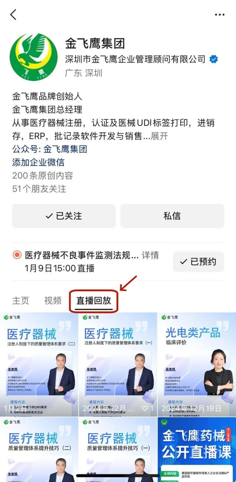 往期直播培训课程支持回放,关注“金飞鹰药械咨询服务”视频号并点击视频号主页,即可查看“直播回放”哦~