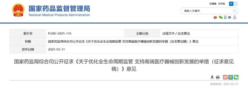 3月31日,国家药监局发布《关于优化全生命周期监管支持高端医疗器械创新发展的举措(征求意见稿)》(以下简称《举措》),从多方面提出支持举措,全力推动高端医疗器械的创新与发展,现向社会公开征求意见。