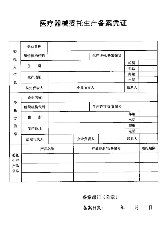 1、第一类医疗器械备案凭证 2、医疗器械委托生产备案表 3、营业执照 4、第一类医疗器械生产备案凭证 | 5、委托生产合同复印件 6、委托方的《第一类医疗器械生产备案凭证》或创新医疗器械特别审批声明 7、委托授权书 8、申报材料真实性自我保护声明 |